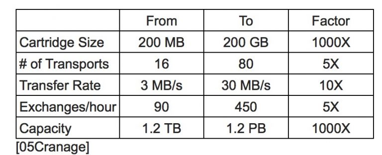 The SL8500 is the successor to the ACS, ~2005 → ~2025. Even though it’s still in Oracle’s catalog, there’s nobody there to help. Starting with a capacity similar to the ACS at it's end, it will end at around 10,000 × 18 TB—a very respectable factor. (but could/can still end much later, don't you think?)